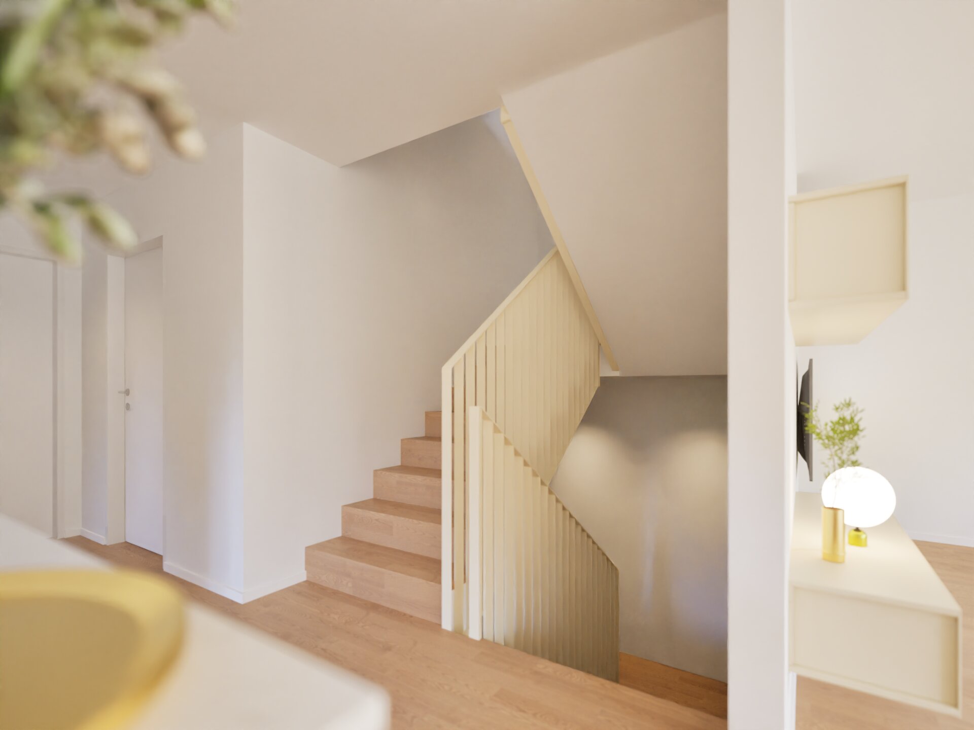 Zwei Mal 5½ Zimmer, zwei Mal 135 Quadratmeter Nettowohnfläche, das ist der Haustyp D55. Er bietet ausreichend Raum für zwei Familien und besticht durch einen klaren, linearen Auftritt.