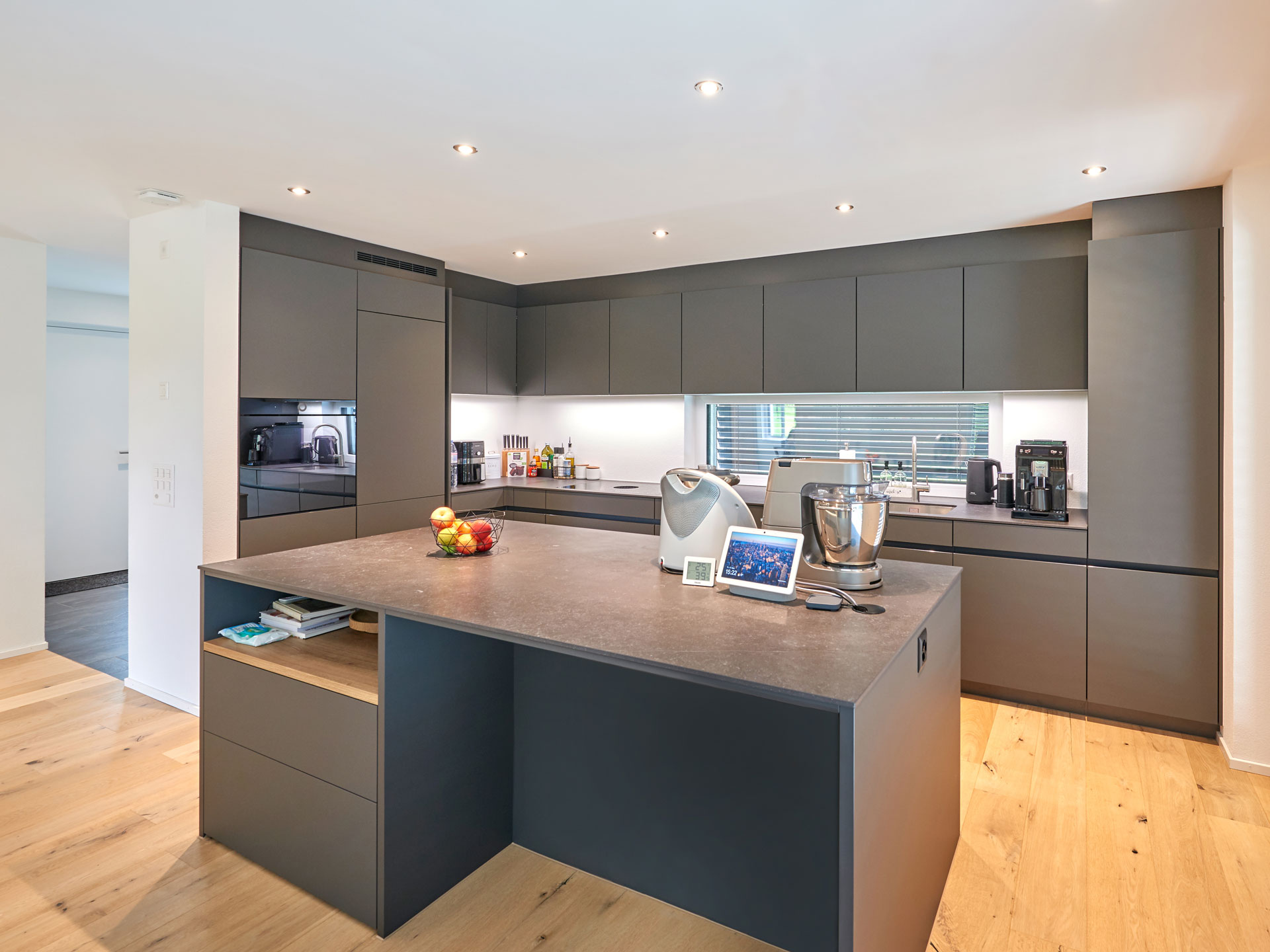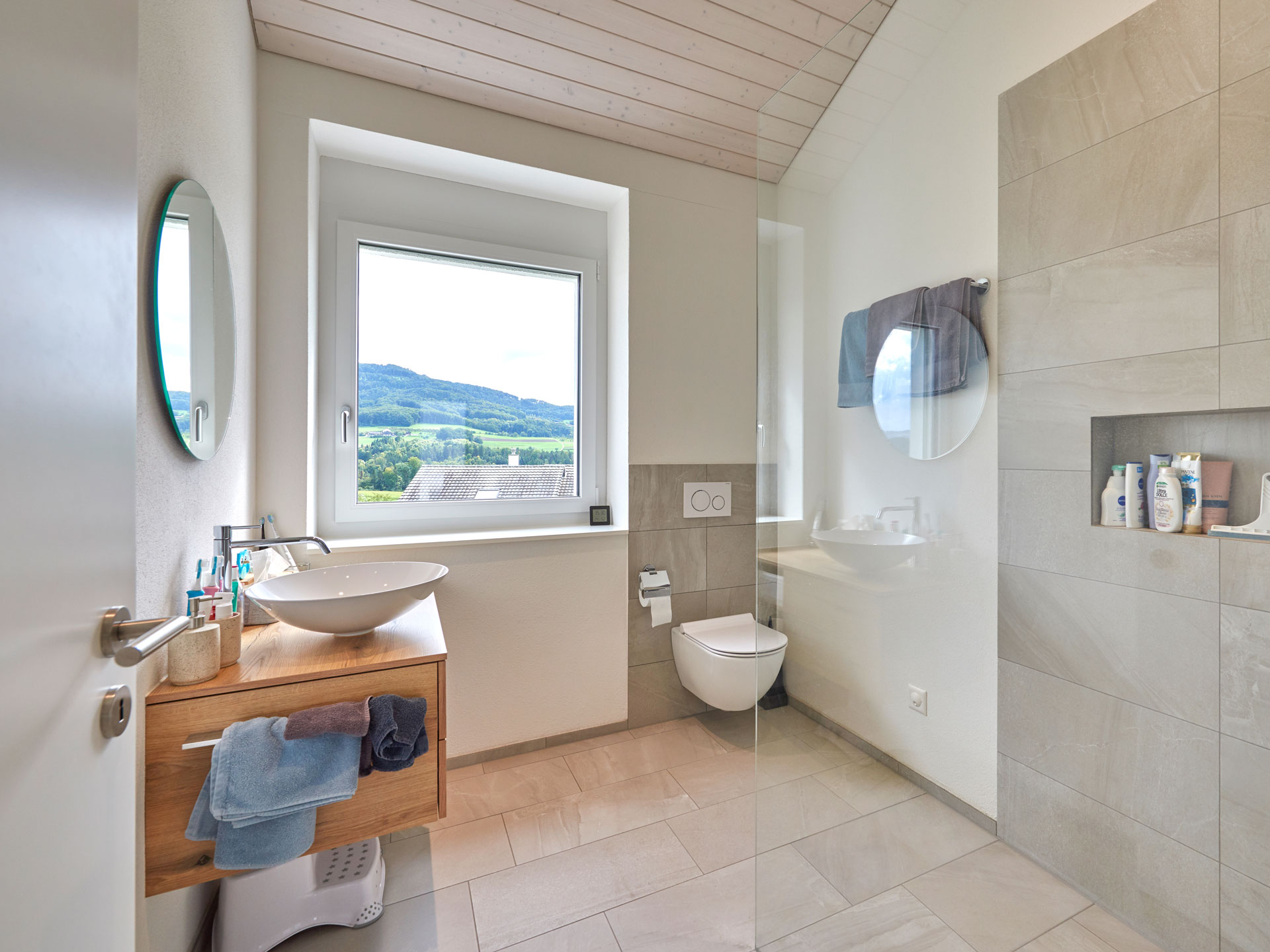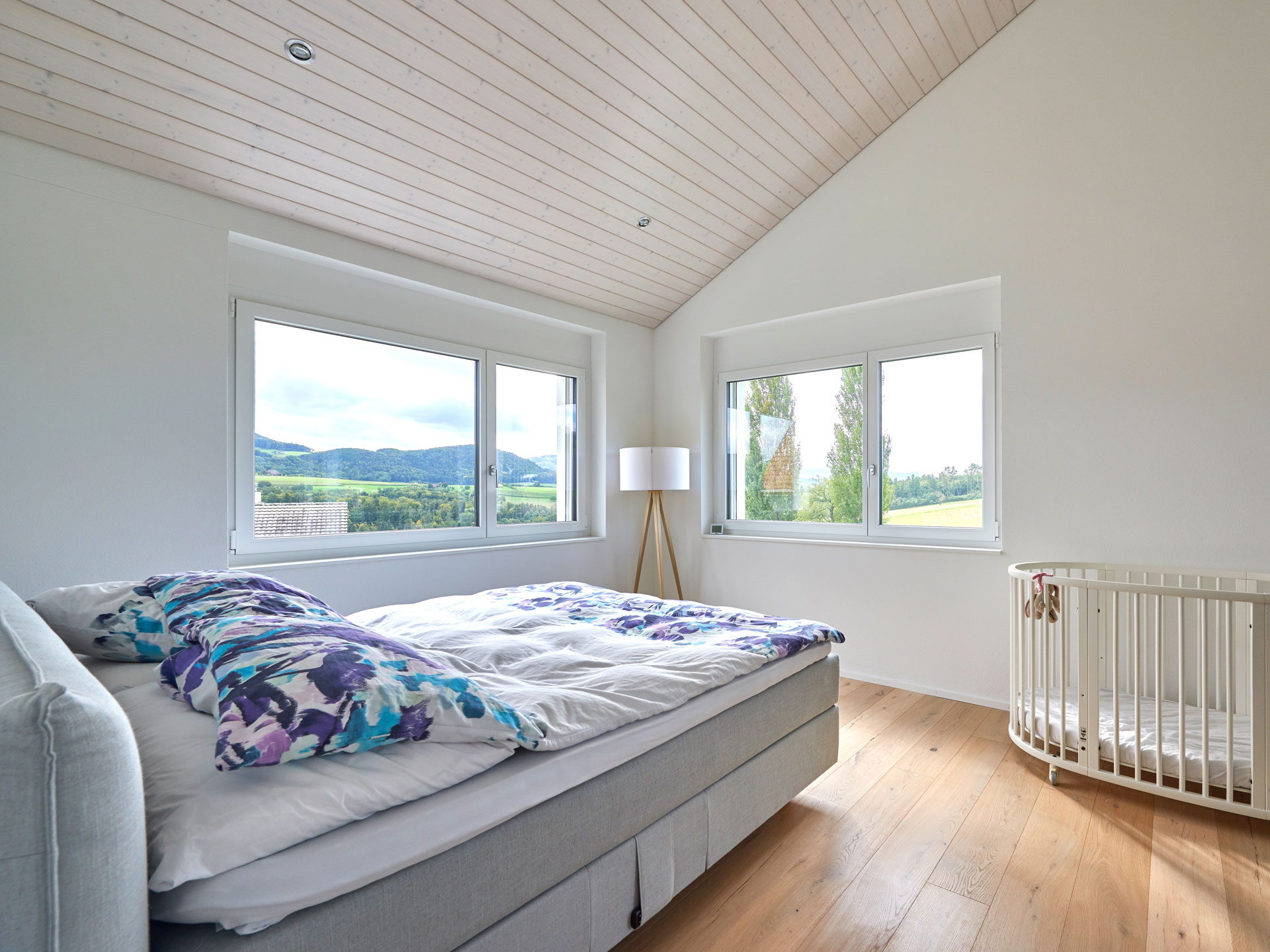 Der Idealbau-Haustyp W60 erwies sich als ideale Grundlage, die allerdings gemäss den Bedürfnissen der Bauherrschaft weitestgehend angepasst wurde. Gefordert waren eine grosse, helle, mit einer offenen Küche verbundene Wohnzone, zwei Nasszellen im Obergeschoss sowie ein offener Giebelbereich. Dazu sollte das Elternzimmer direkt mit dem Bad verbunden sein.
