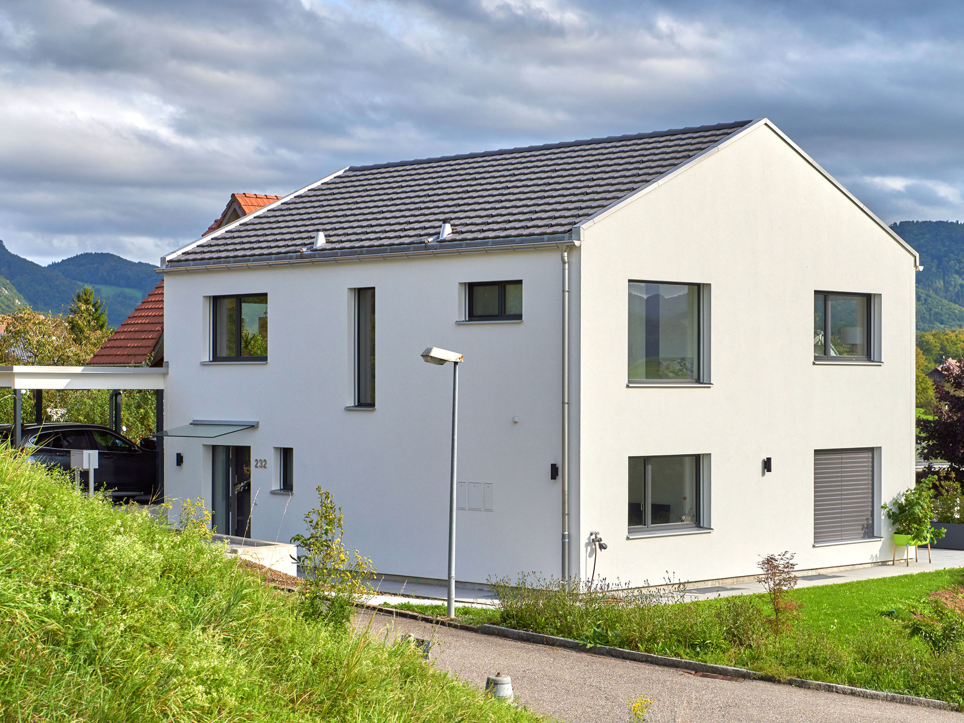 Flachdächer waren in dieser Bauzone für Hauptbauten nicht erlaubt und so entschied man sich für ein Satteldach. Dabei verleiht aber das Fehlen von Dachvorsprüngen dem Haus einen durchaus frechen, gleichzeitig nicht zu allzu modernen Charakter. Ein Doppelcarport komplettiert die Wunschliste der Bauherrschaft.